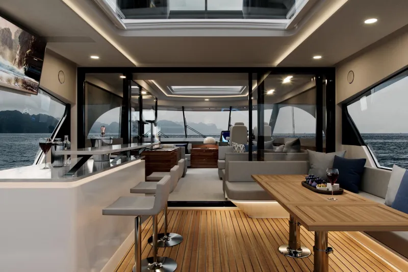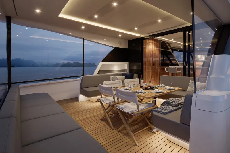 The M75 upper cockpit and adventure deck creates an incredibly versatile hub for lounging, cooking, adventuring or storage, with plenty of room to spare. The defining feature of the Maritimo M-Series is its recognisable enclosed flybridge skylounge with internal staircase – providing the largest indoor outdoor living space of any m-series model