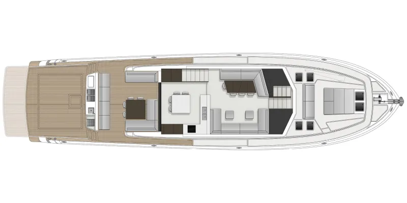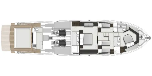 The M75’s climate controlled flybridge skylounge offers unprecedented amounts of interior space through the design of the exterior wings melded within the swept contours of the flybridge’s exterior form. The space incorporates a pair of distinct internal lounging areas, with a forward cruising lounge and aft TV lounging, which can both conveniently convert to additional sleeping berths if required. Beyond the flybridge sliding glass doors, the flybridge balcony deck offers further unprecedented amounts of deck space.