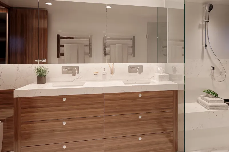 It is midships where the M75’s grandeur can be completely experienced. The master stateroom is centered upon a centerline king size bed with cavernous rear ensuite and walk-through robe area. Storage is prevalent with double full height hanging robes, double half-height robes, and copious amounts of customizable drawer, desk and lounge storage available.