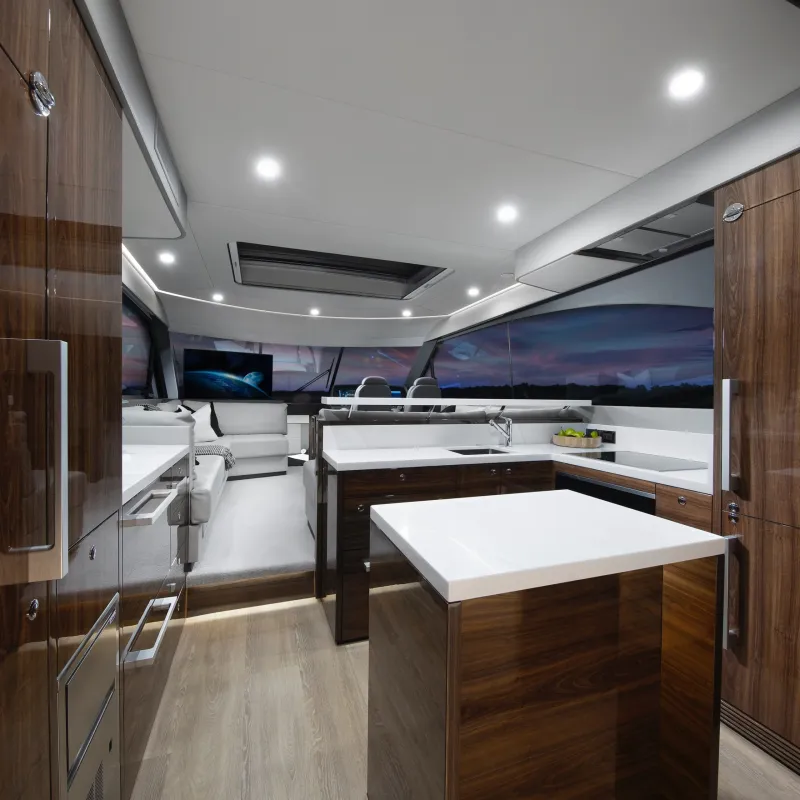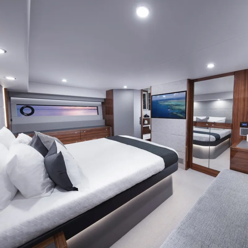 Maritimo’s iconic aft galley seamlessly connects the upper cockpit deck and the enormous saloon lounging area. Injecting natural light and air from the surrounding vistas are the option of Maritimo’s unique two-stage vista sliding windows which transform the areas into an indoor/outdoor retreat.
