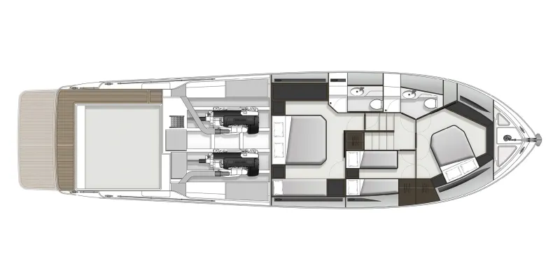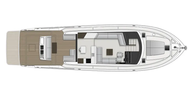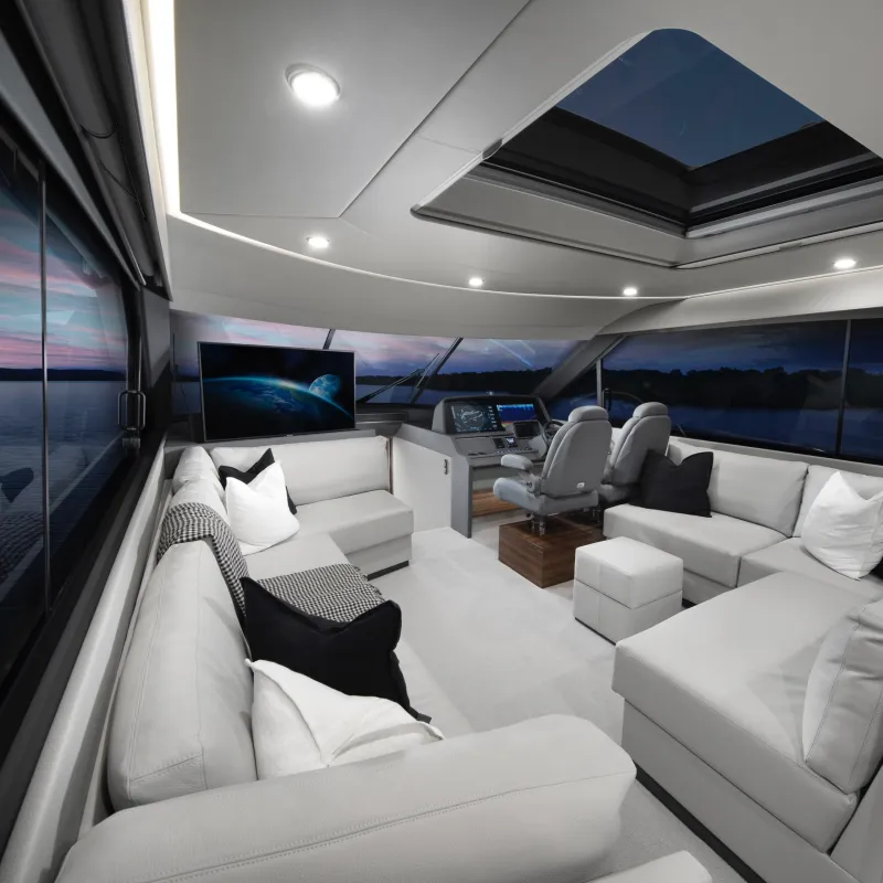 The reimagined adventure deck and lower cockpit space offers a fully lined 3.2m tender garage beneath, whilst the large alfresco upper cockpit provides considered and versatile living space. Deep walk-around decks with minimal steps provide safe and easy accessibility for the whole family.