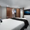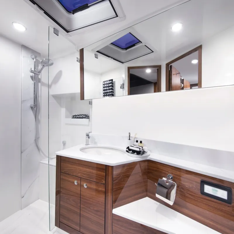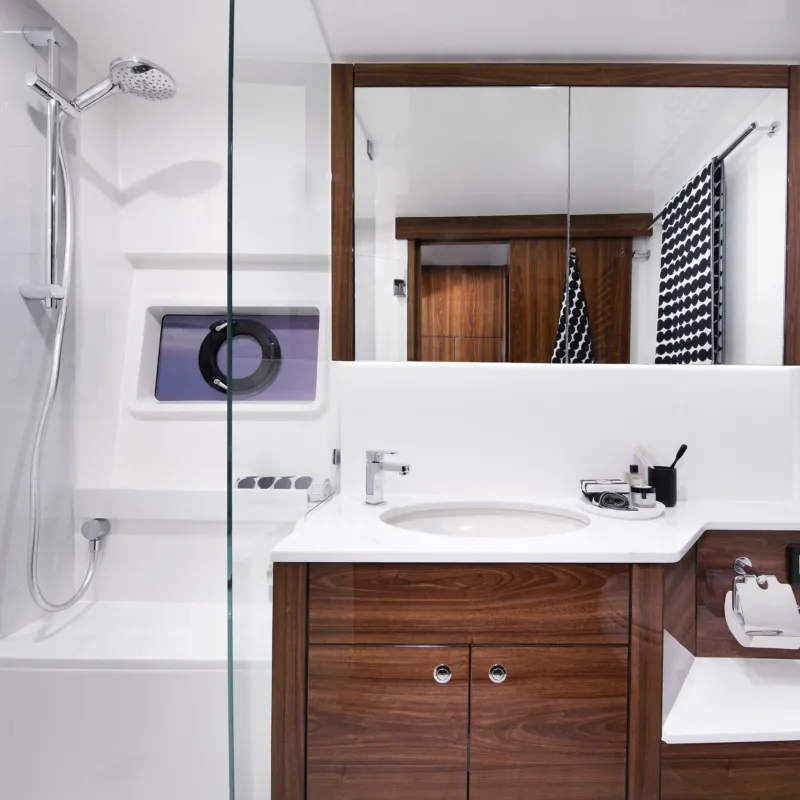 Below deck free-flowing spaces utilize the hull’s volume, maximising height and minimising the number of steps. Three spacious staterooms and two ensuites are on offer, with full-beam king master stateroom, offset queen forward stateroom, and twin single starboard guestroom.