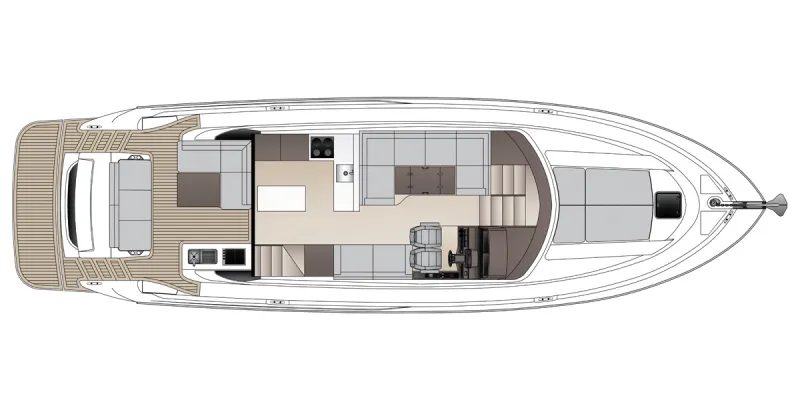 The expansive cockpit features a starboard side entertainment unit and two opposing euro lounge units that can be combined to form an eight-seat protected dining area. Hallmark secure walk around decks enable safe passage to the forward deck entertainment area with lounge bed with folding backrests.