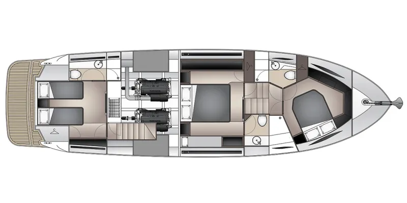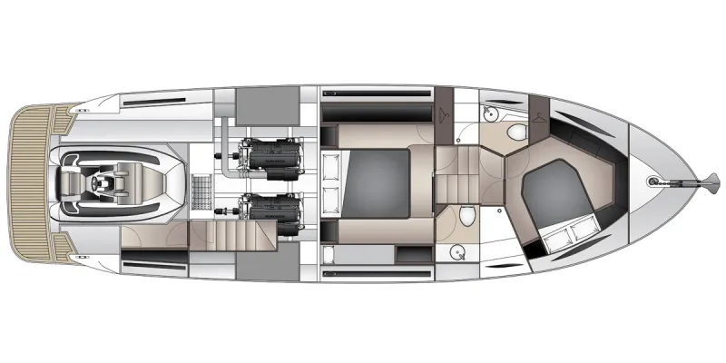 A critical performance factor inherent in all X-Series hull design, is the ability to neutrally balance the hull through the planing range. Volvo Penta D11 670mhp or 725mhp power units are located further forward to neutrally balance the hull and minimise shaft angle, resulting in increased efficiency from the 5 Blade Nibral propellers and a flat efficient planing attitude, this is made possible by incorporating additional accommodation aft of the engine room. Maritimo’s world renown patented engine room moulding technology provides more strength and weight reduction with added serviceability and reliability.