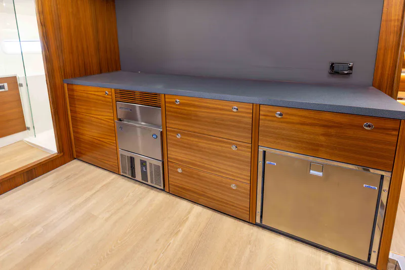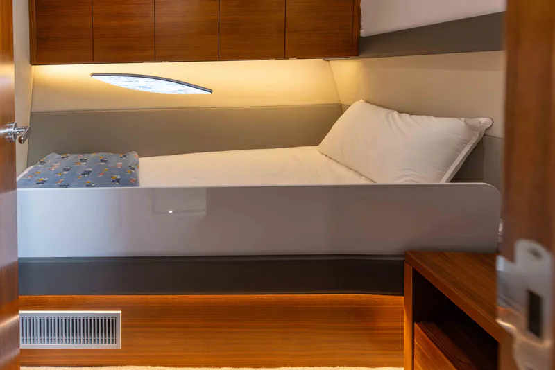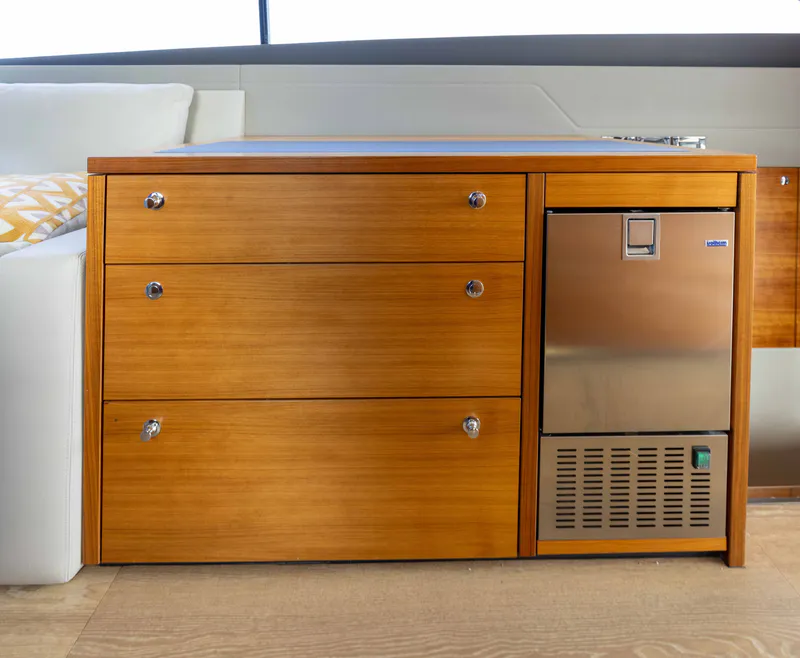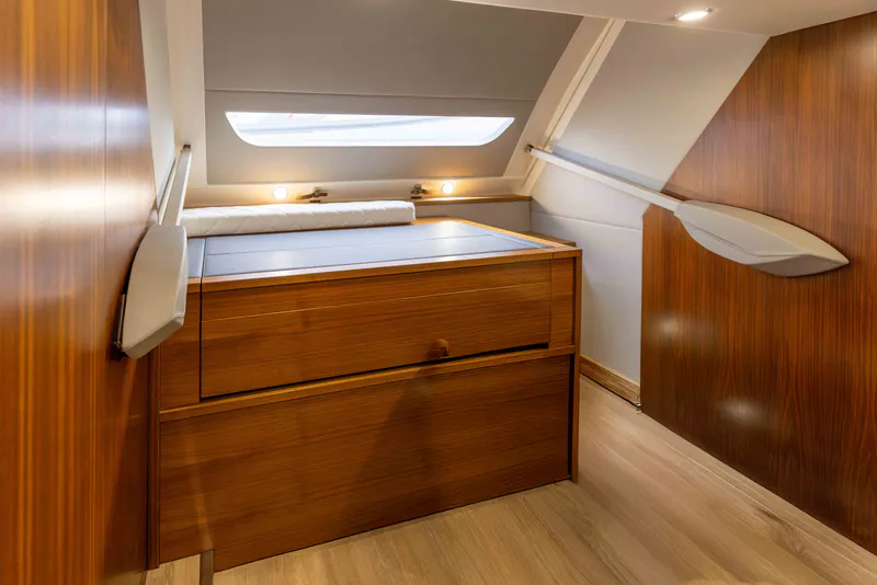 This Maritimo X60 aft cabin gives a new level of customisation. With options designed to cater to a range of needs, it is offered as a beach club, with a double pull-out bed, day head and shower, or it could be used as a utility storage area. Revolutionising on-water entertaining, the game-changing ‘beach club’ design flows effortlessly into all areas of the boat, creating constant connections between guests and the sea.