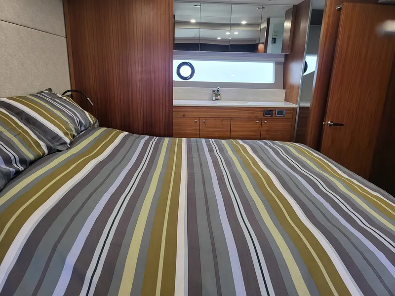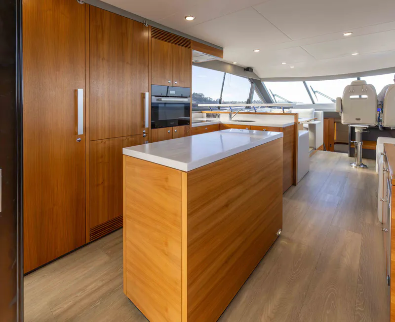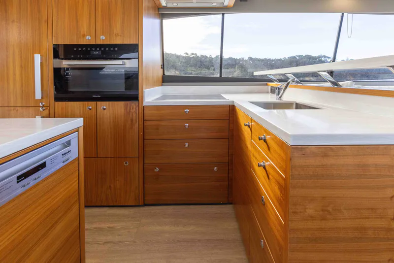 Expansive panoramic sliding windows in the saloon open to fresh ocean air and endless vistas of the water and skies. Here, the galley flows seamlessly into the cockpit when entertaining, or forward to the lounging and dining area when relaxing. The comfort this Maritimo has to offer is simply divine, and entertaining is made easy with Miele appliances, ample refrigeration, ice maker, water maker and BBQ. The walnut satin timber finishes with the luxury leather lounges create an ambience and warmth, and it is a beautifully appointed space to share.