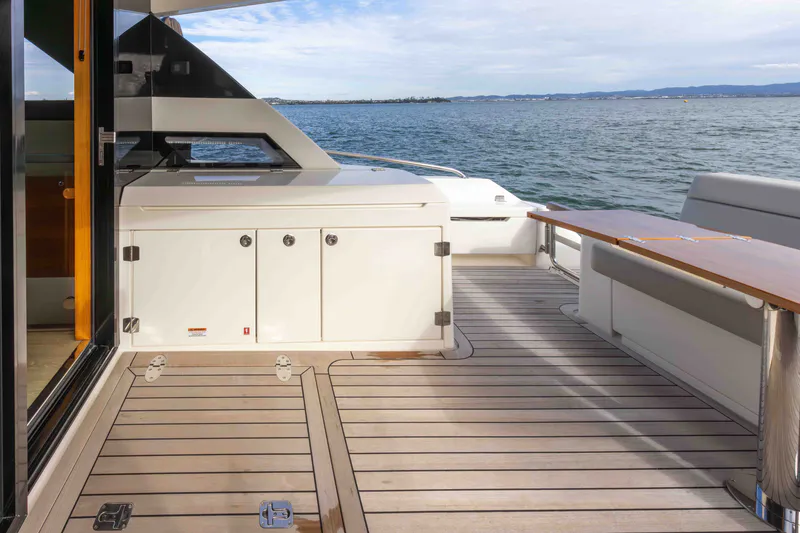 The cockpit is another great space with alfresco dining, comfortable outdoor lounge seating with a fold-out table, and a step down to the hydraulic platform with SS removable rails and bait boards. The swim platform is also an ideal space for storing your tender when not in use for water sports or fishing.