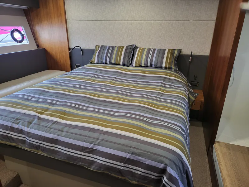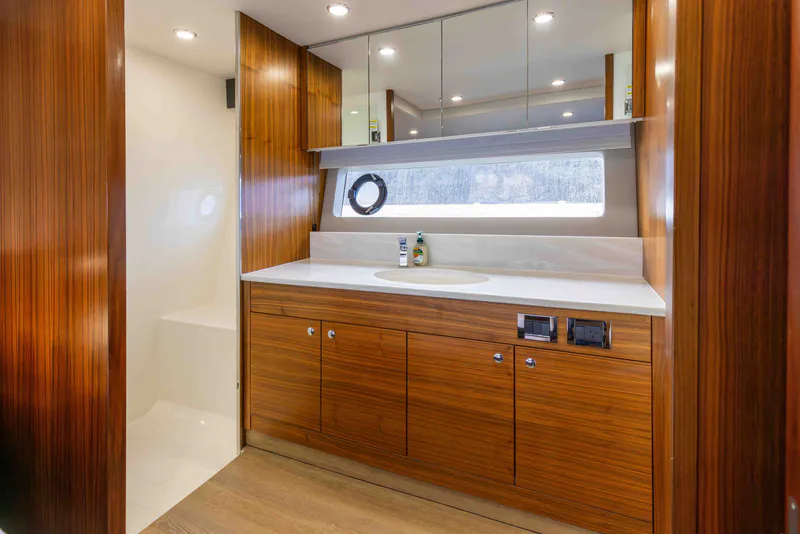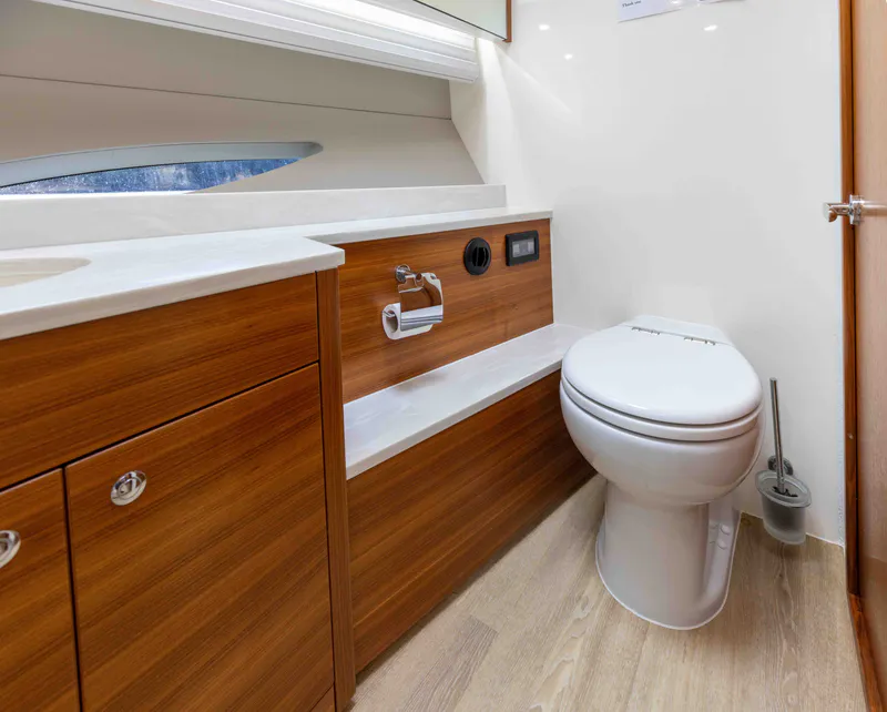 Timeless luxury as you step into the beautiful full beam master stateroom with ensuite and side hull windows. Accommodation in the remaining two other cabins provides for a relaxing space for your guests, with one double cabin, twin single bunks and a shared bathroom.