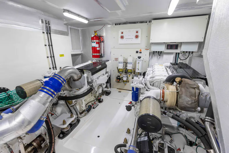 Power is from twin Scania 925HP engines with approximately 420 hours, fuel capacity of 4200L, and an array of Garmin electronics, Twin disc station hold and hydraulic bow/stern thrusters.